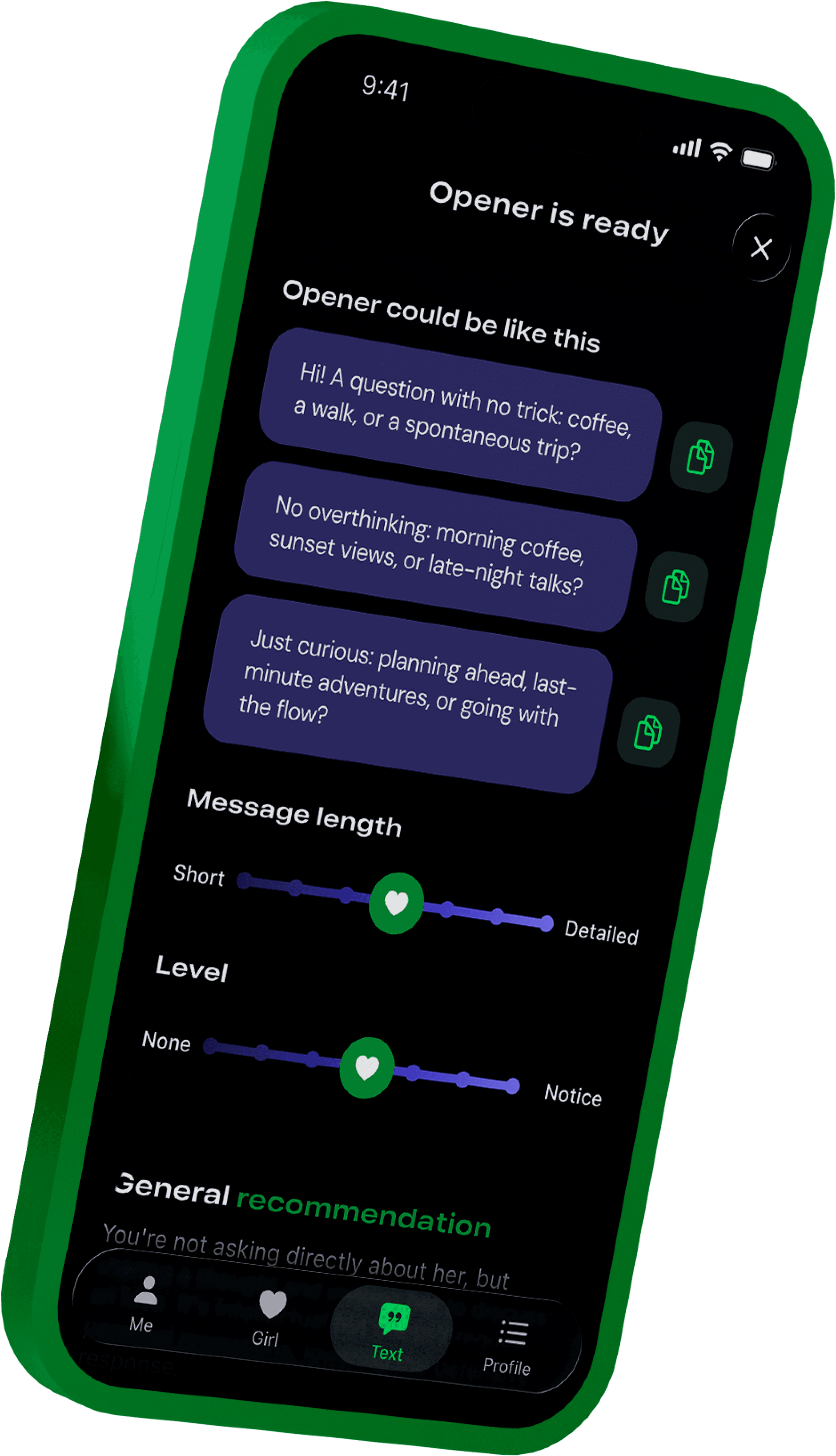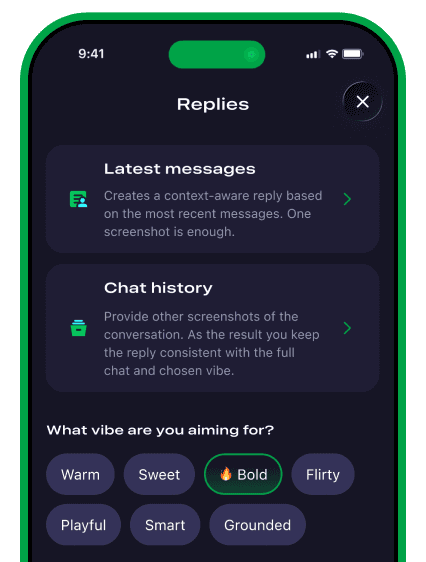 Create meaningful & working opening lines and replies that fit the context and the tone you want. Keep chats alive, avoid awkward messages, and move things toward a date!