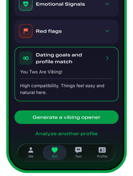 Not sure what her profile or vibe is saying? Based on the provided info, get a quick read on personality, intent, and how to approach the conversation and get that first date!