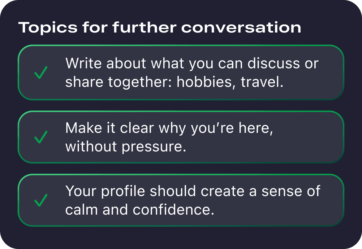 Based on the uploaded profile screenshots, you get clear feedback on what works and what holds you back. Enhance your first impression and increase your matches.